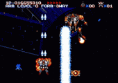 The weapon system in M.U.S.H.A. is great. You can power up your main gun by collecting power chips that fall from a carrier which periodically appears onscreen. Once you have enough, they can be configured to fire in one of six directions (forward, three-way, back, reverse, roll, and free). Additionally, there are also three special weapons to collect: red, blue and green. Red gives you a bomb spread that annihilates everything in front of you, green releases twin laser blasts of awesome strength, and blue provides a shield which protects your ship from enemy shots and collisions. All weapons can be maxed out in four levels and the twin system (regular and special shots) make for some tremendous firepower.