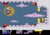 You can choose three areas of adventure, at first you can walk through the lush green forests, filled with rude trees, really cute monsters that want to kill you, and little gherkin men who puke out seeds like there’s no tomorrow. They may be tons of them but they are no match for your kick ass blade and magic repertoire. After strolling through the forest, you’ll enter a cave, do battle with a nine foot, fire spewing, fist extending rock monster and meet up with a half-dressed goddess who’ll give you a nice magic present. The next levels are set in heaven, where you don a feather cap and soar through the sky, doing battle with two headed turtle-dragons and clashing magic with a deity who wishes to test your combat skills.