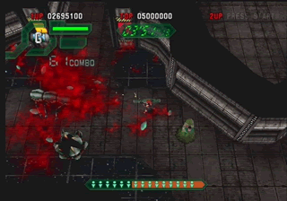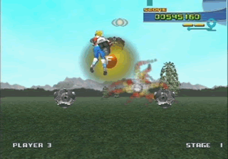 Sega’s altering of the graphics produced mix results, and the same can be said about its tinkering with the gameplay of certain titles. For example, Space Harrier has now been made more to play like Panzer Dragoon, complete with lock-on feature and everything. Some may argue that this added dynamic makes the game more interesting, but the fact is, it isn’t the Space Harrier I remember. On the other hand, Alien Syndrome‘s run-‘n-gun style of play has been enhanced through the addition of a combo system that depends on the amount of enemies you kill. Moreover, the new. bloody-gushing deaths of your alien foes has given the game a teen rating, and while I admire the desire to refine the gameplay, Sega should have put those ideas to work in a real sequel.