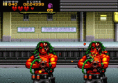 The easy gameplay is complimented by some slick presentation. Bright, colorful graphics and tons of sprites bring the action to life in splendid fashion. I really like level of the detail Sega added, and it’s always fun to blast everything in view apart. The level of destruction is quite large, and walls become riddled with bullet holes and windows shatter. (Be careful where you shoot though, as sometimes taking out a door reveals a machine gun-toting baddie lying in wait.) You can destroy vending machines, doors — you name it. Enemies look great and bosses are large enough to sometimes take up several screens.