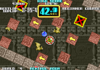 Simple, yet highly addictive. That’s about as much as can be said about Cameltry. No, wait…it’s incredibly addictive. Any doubt about where Sonic Team’s inspiration for the original Sonic The Hedgehog‘s bonus stages came from can now be put to rest, as they almost certainly had to have been influenced by this great and underrated gem. Cameltry goes way beyond simply maneuvering the ball around a rotating maze, and incorporates some cool elements that really add to the challenge. You can make your ball jump and break blocks to move forward, and there are also several obstacles that sap away at your time limit. Charging your jump also adds to the ball’s bounce, so it’s important to measure how much power is needed.