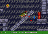 The visuals are detailed and cute, with lots of unusual sprites and monsters. It took me a long time to realize I wasn’t playing the princess, because in the main game the prince looks like a girl. Some of the better-looking graphics show up during the boss scenes, where the characters are twice as large. In the arcade version, it zoomed in on those sprites, but not on the Genesis. Speaking of arcade vs. Genesis, I suppose I ought to point out that the home version remains pretty well intact by comparison, which makes sense because the hardware was similar. It didn’t lose much color, but since the Genesis is lacking in pastels, the soft look of the arcade is no longer there. That is not such a terrible thing if you’re a man (heehee). What is worse is the occasional slowdown and loss of extra background planes and sprite rotation, such as when the rollercoaster goes loop-d-loop and the whole screen turns with it. Yet here and there the home port has been tweaked, often for the better. The clock is now extended to the point of being irrelevant (you no longer need to rush to finish a stage) and cheap deaths are harder to come by. Best of all, there’s now more levels — three more stages per each of the four sections of the amusement park.