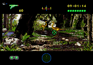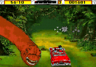 The Sega CD Jurassic Park is a completely different game from its Genesis sibling. It combines the almost dead form of point-and-click adventure types with FMV video sequences requiring the correct input to pass. Your objective is to search the island for dinosaur eggs, and you have a strict twelve hour time limit. The three weapons assigned to you are stun gun, tranquilizers, and grenades. Each one is more effective in certain situations with certain dinosaurs and thus gives the game little more thinking depth. Those looking for all-out action should look elsewhere, but gamers interested in a cool adventure game need to check this one out.