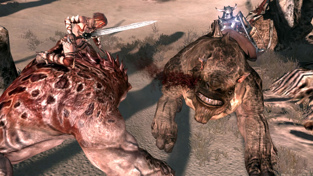 Not to say that combat is any better. I was quite amused when I read Dave Halverson’s thoughts on why no one but him understands and appreciates Beast Rider’s gameplay, and I’m sorry to say that after playing the game through to completion, I’ve arrived at the conclusion that Dave is just… nuts. The timing and execution of the combos isn’t a problem, and it’s quite possible to whip the stuffing out of a foe with several cool-looking hits in rapid succession, leaving him a bloody and dismembered mess. No, the problem is that nothing ever changes throughout the game. The same combos and moves Tyris masters in the initial tutorial are the same ones she performs in each and every battle from there on out. There are no new moves to be learned, no combo upgrades, nothing. It’s ironic that this should come from Sega, the same company that released another action slasher this year called Viking: Battle for Asgard which offered ample opportunity to upgrade one’s combat arsenal in a myriad of ways, even including stealth kills. In comparison, Beast Rider’s attack schemes are just limited, dull and repetitive. This might have been acceptable back in 1989, but it’s one aspect of the classic gameplay that should have been left in the arcades.