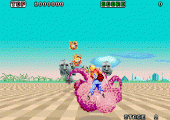 Speaking of which, if you don’t have a controller with a turbo option, you’ll wish you had. The control is fine, as you can maneuver with speed and precision, however, this game requires nonstop firing, and without rapid fire, you’ll quickly tire of incessantly pressing the shot button. I recommend the original Sega Arcade Power Stick to maximize your efforts, as the joystick control and turbo fire will keep your thumbs from falling off. Why Sega didn’t include a rapid-fire option in the game itself is inexcusable, especially after all the successful Genesis shmups prior to it that had automatic rapid fire, including ironically, After Burner. Not only do you fire constantly, you must always be moving Harrier around the screen, as the action never lets up with incoming enemies and other numerous objects that you must avoid through 18 levels.
