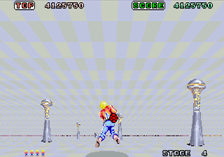 You are in control of a flying man, armed with a giant cannon that shoots balls of pulse energy. The playfield scrolls forward at a fixed pace, and you are afforded the freedom to move anywhere on the game screen you please, in order to avoid obstacles and fire upon incoming enemies. While the display graphics are in 2D, the game is trying to convey a 3D feel, with enemies and obstacles appearing tiny in the background, and then scrolling forward until they are practically in your face. The 32X is able to handle the scrolling better than any previous versions, and while I think Space Harrier was never ported badly in the past, Sega basically got it perfect on this last effort.