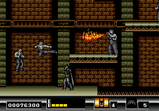 The Genesis Batman retains the feel of the film better than its NES sibling, but it suffers a bit as a result. The graphics are bathed in browns and grays, and the level design is lackluster, stuck in its fixed scrolling purgatory with none of the variety found in the NES game. The Genesis game carries on that plodding side scroller feel of a lot of late 80s arcade clasics like Altered Beast and E-SWAT with how stiff Batman feels and the way he determinely plods through each level. It feels like a Data East game to me; you could re-title it Bat Dudes, and I wouldn’t blink.