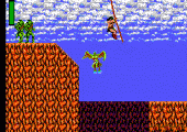 With the gameplay, there are a few things to keep in mind. While Rastan is a port of an arcade game, it’s also an altered port. Like the arcade, you can swing your sword, thrust it downward, or stab up at airborne enemies. You’ll jump over pits, swing from vines to get over spikes/lava/water, float on rafts to cross the water, and dodge a boulder or two that gets in your way. More powerful weapons like a battle axe, mace and a flaming sword will be temporarily gained to kill enemies faster, while items such as a shield (½ damage from being hit), a mantle (½ damage from touching enemies), armor (both half damage items at once), life replenishers, a ring (double points), a rod (longer lasting defense items), necklace (longer lasting offense items), some cloth (kills on-screen enemies), gems (points) and even poison will be dropped by defeated enemies. The stages are still filled with various enemies, from harpies and chimeras, to armored warriors and wizards, and some spots offer more than one path to walk down (usually a higher route and a lower one). So, while those familiar with the arcade game will see things and traits they recognize, there will also be a fair bit that’s “new.”