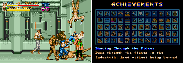 I want to go into a bit more depth about those 60 unlockable achievements I mentioned. The achievements will progressively unlock new features and gameplay modifiers through the “Mega Mode” menu. Players will be able to turn on or modify different power-ups and challenges to customize their experience as they achieve more. The early rewards are all gameplay and cosmetic changes, such as changing boss themes from Final Fight 2 or 3, enabling air combos, or adding instant knockout punches. Other unlocks will include new modes, such as a boss rush mode and bonus stage challenges. They will also include gameplay modifiers such as changing food item rates, modifying weapon availability, and randomizing enemy appearances.