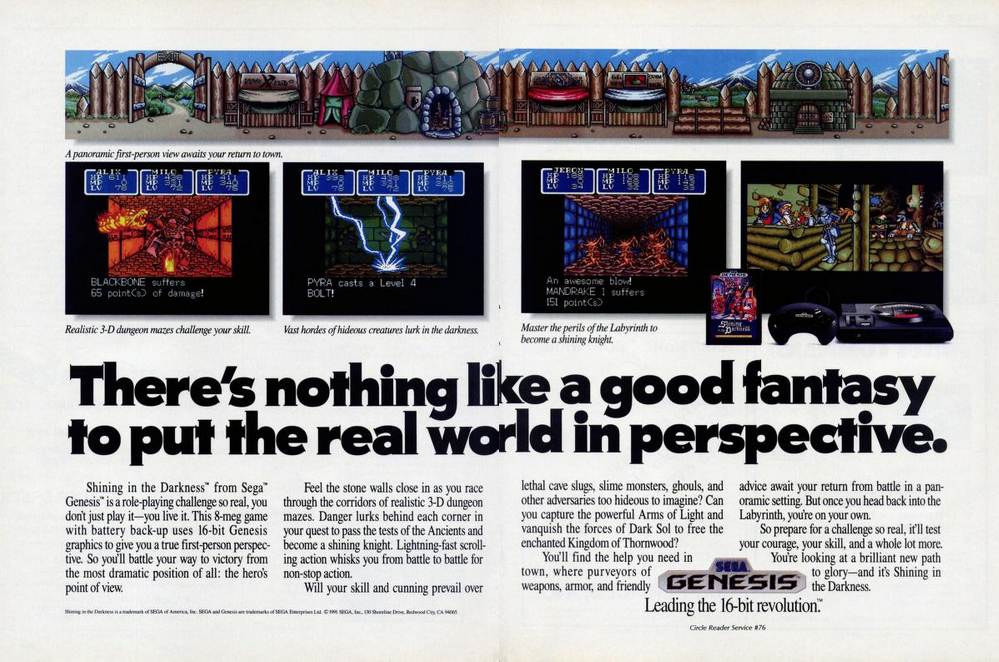 According to former Sega of America marketing head Al Nilsen, Shining in the Darkness was successful for an RPG in the U.S., even with a higher price due to its 8-megabit cartridge size and the inclusion of a battery backup feature. He contends that SOA’s advertising was enough to generate sales for the Genesis RPG lineup overall. “From what I remember, it did well for an RPG, not huge numbers but a good loyal dedicated audience. They weren’t titles that got TV promotion, but they usually got magazine ads,” he told the author. Indeed, both Genesis Phantasy Star games, Fatal Labyrinth, and Sword of Vermilion all saw printed ads. As expensive as TV time was, Sega of America needed to reserve its limited marketing budget for titles with a larger potential audience, such as a certain blue hedgehog who would arrive in the U.S. a scant three months after Climax’s Genesis debut. Unlike those other RPG titles, however, Shining in the Darkness had but one print ad in U.S. magazines, and it didn’t run too frequently. In fact, ads for Phantasy Star III, which was released in North America four months later, were already running when Shining in the Darkness debuted, appearing in several prominent magazines like GamePro and Electronic Gaming Monthly.