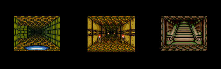 To pull off the first-person dungeon view in Shining in the Darkness, Taguchi leaned heavily on a deep understanding of what the Mega Drive could and couldn’t realistically do. Instead of chasing full real-time 3D, which would have been technically possible only with severe compromises, the engine was designed around tile-based tricks and a carefully controlled perspective that played to the strengths of the hardware. The dungeon view was built on a strict single-point perspective, assembled from pre-drawn wall segments, and the walls were composed from tile patterns that changed based on distance, giving the illusion of depth in discrete steps. As the player moved or turned, the game rearranged and scrolled these wall segments to simulate motion through space. Naitō made the floors and ceilings much simpler, often repeating a small set of tiles to help keep the illusion stable and avoid unnecessary VRAM churn. The result wasn’t true 3D, but it made a convincing and fluid approximation that worked well within the Mega Drive’s limits. This approach was different from what games like some of Sega’s other Mega Drive RPGs, like Sword of Vermilion, did. That game also used first-person dungeon views but relied more on static screens with abrupt transitions. Shining in the Darkness aimed for smoother motion and continuity, which required far more dynamic tile updates and scroll manipulation, even if it meant shrinking the playable window and simplifying certain elements.