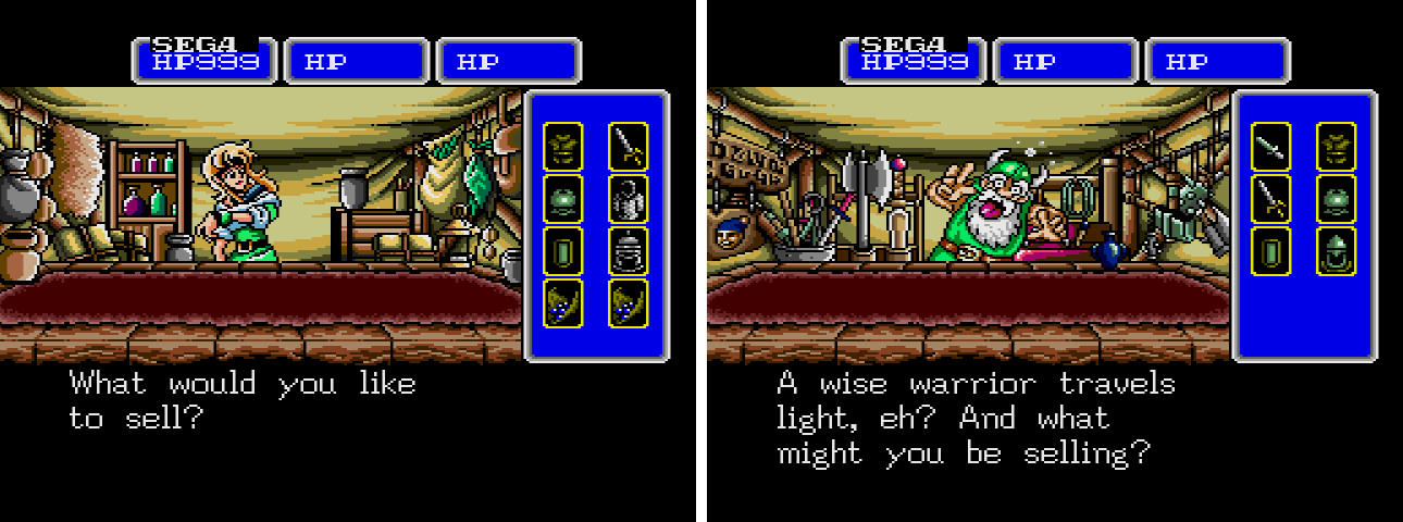 Players could name the hero however they wanted (it would default to Max if a name wasn’t chosen), but Milo and Pyra were fixed characters, and both were as equally talented – and inexperienced. Milo, a hobbit priest-in-training, was Max’s best friend and a flexible character with good attack power and healing abilities. Milo’s name in the Japanese version was “Bilbo,” and both the name and his race were likely references to Takahashi’s love of Tolkien. Pyra the elven mage was also a close friend of Max and joined the quest whether he liked it or not. Her offensive magic was as powerful as her fiery personality. Like Phantasy Star, players began the game alone and recruited their companions only after completing a specific objective. Here, a large crab that surprised Max at a hallway corner in the labyrinth had to be defeated before Milo and Pyra would appear in town. A few other NPCs could temporarily join the party, often after players found them lost in the labyrinth. The elf Dai (tallyho!) and Gila the mercenary are two that appeared, occasionally helping out during battle until they were safely escorted back to town.