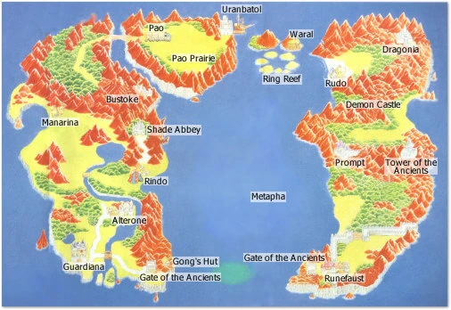 And understandably so. Shining Force had an entirely different gameplay style, so the question was how it could build upon the already-established world while still achieving Takahashi’s vision of being something new and different. Shining Force had a deep plot, one that went far beyond what was included in the actual game. Takahashi had created an immense amount of backstory to the lands of Rune, chronicling the identities and populations of its different nations. Alterone, Beagle Mountain Pass, and Dragonia were all locations not included in the game beyond some mention in passing but that had their origins and characteristics painstakingly detailed in Takahashi’s notes. It was clear that he had intentions of establishing these places early so that they would be recognizable to players in later games.
